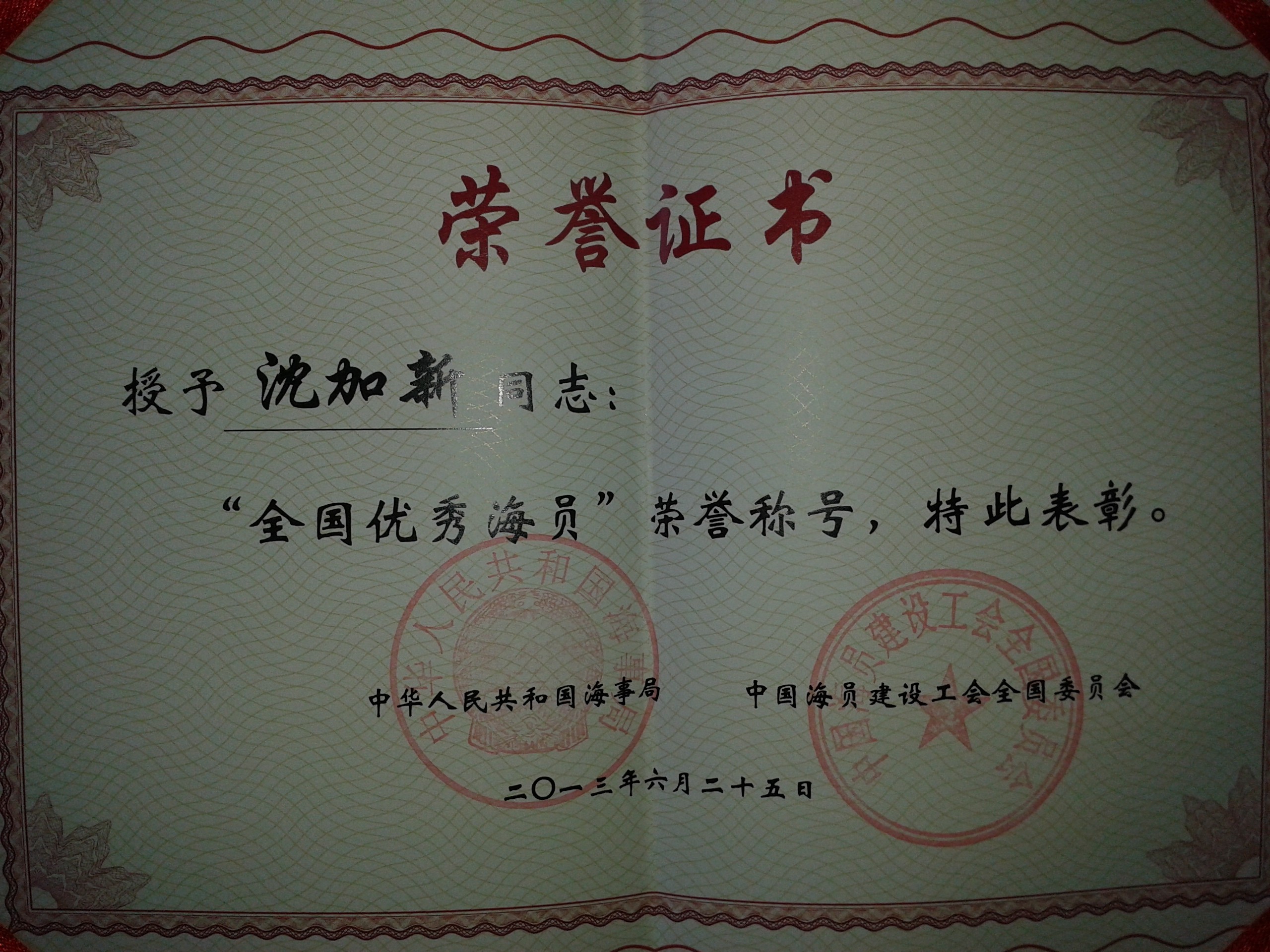 2013年6月沈加新同志被國(guó)家海事局中國(guó)海員建設(shè)工