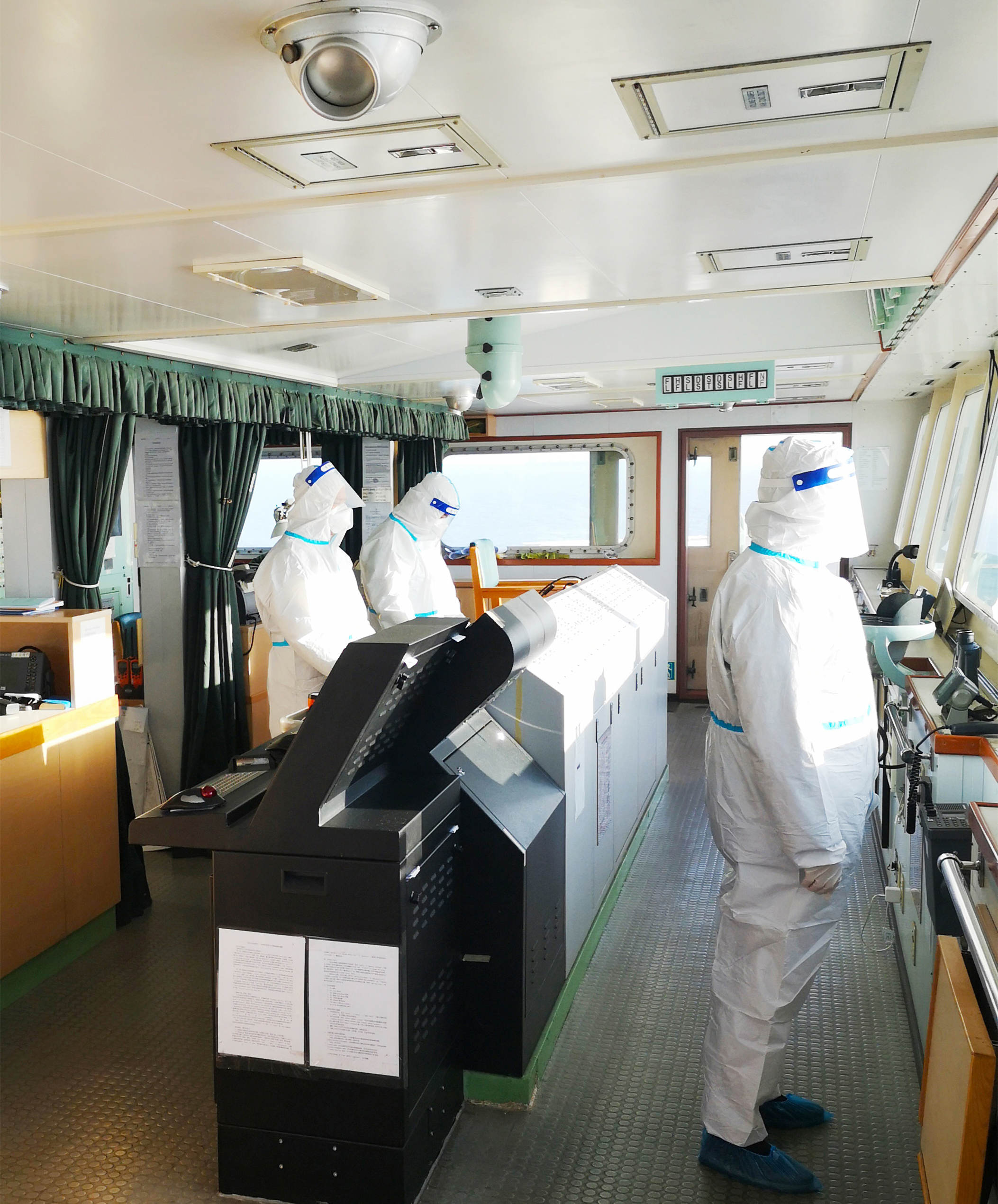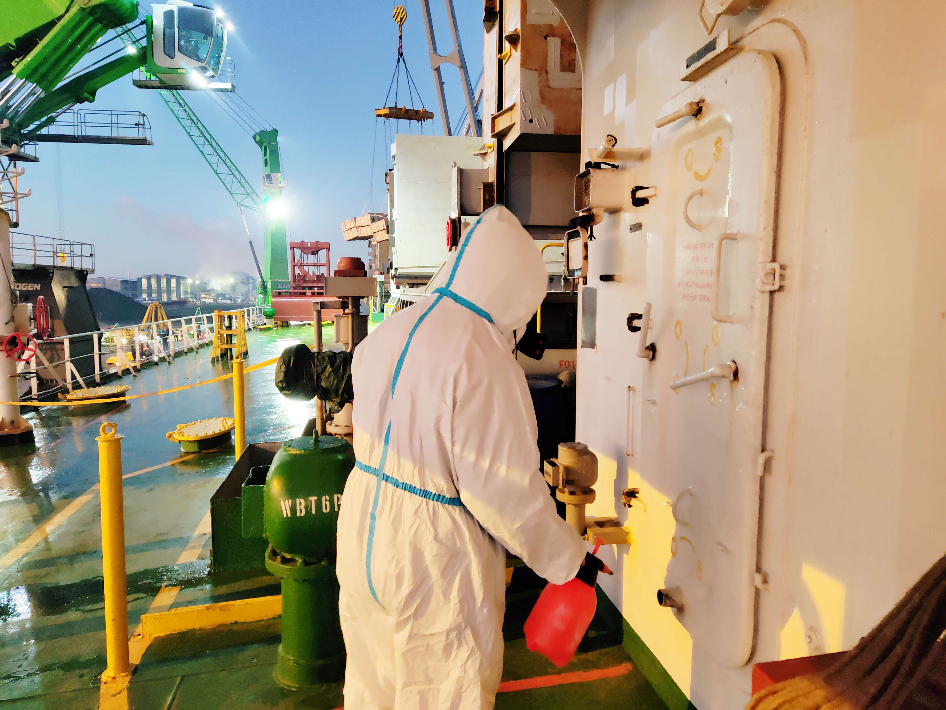 在韓國唐津港,“江遠(yuǎn)常州”輪船員身著防疫五件套,嚴(yán)格做好外來登輪人員的測溫和登記工作。