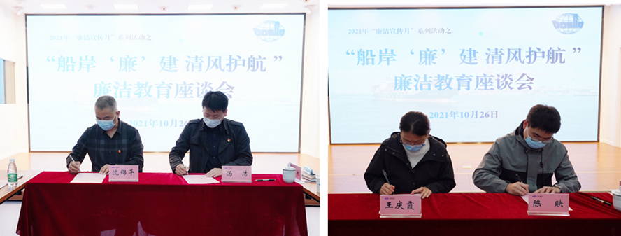 會議通報了近年來公司幾起典型違紀(jì)違法案件,并組織船員、家屬簽訂廉潔承諾書;參會人員圍繞廉潔船舶建設(shè)、強化廉潔宣傳等方面進行深入交流。