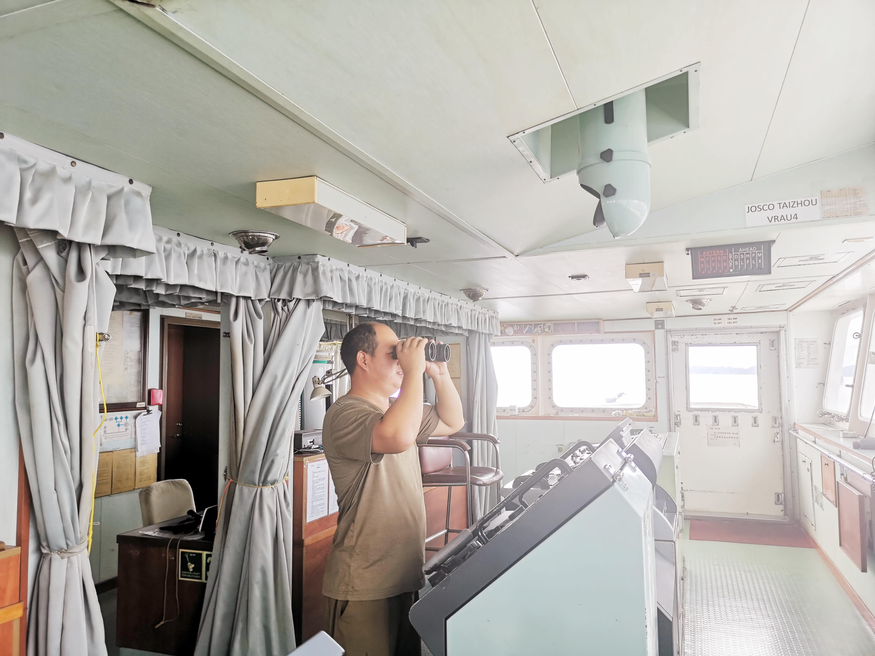 做完工作動(dòng)員后,準(zhǔn)備出工。作為一名水手長(zhǎng),高空作業(yè)我肯定是“首發(fā)陣容”,要起到一定帶頭作用!此時(shí),值班水手老曹和小周爭(zhēng)先恐后,就怕輪不到自己“踩鋼絲”…最終在他們的軟磨硬泡下,我被無(wú)情替換掉。