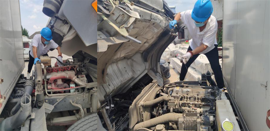 出車前安全員檢查機(jī)油、水箱存量等各項車輛安全指標(biāo),車用消防用品配備情況。