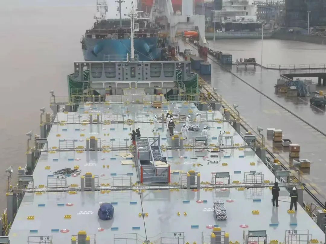 接船的20名船員終于一起登上新造船,熟悉各種設(shè)備。9月10日是中秋節(jié),正常放假三天,可是距我們計(jì)劃9月15日交接新船時(shí)間太緊迫了,接船船員和監(jiān)造組主動(dòng)提出來11號(hào)開始加班,和廠方協(xié)調(diào)由部分人員加班幫助我們吊物料和綁扎件,廠方也被我們的敬業(yè)精神打動(dòng)同意加班。