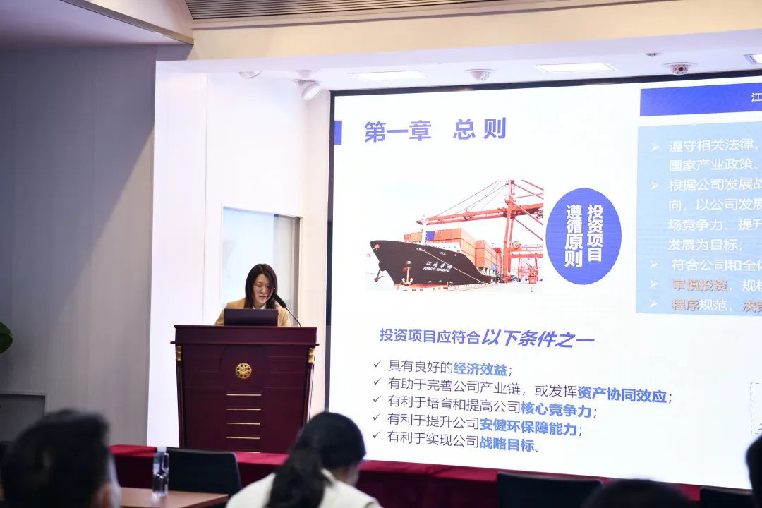 投資發(fā)展部宣貫《江蘇遠(yuǎn)洋運(yùn)輸有限公司投資管理制度》。該制度明確了公司黨委會(huì)、董事會(huì)、總經(jīng)理辦公會(huì)的投資事項(xiàng)審批權(quán)限,詳細(xì)規(guī)定了投資管理流程,對(duì)進(jìn)一步規(guī)范公司投資行為,提高投資決策科學(xué)性,防范投資風(fēng)險(xiǎn)具有十分重要的推動(dòng)作用。