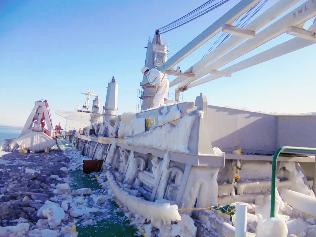 1月13日,江蘇遠(yuǎn)洋所屬遠(yuǎn)盛公司管理的“北部灣崇左”輪從新加坡駛出,將到天津卸貨。隨著船舶一步步北上,氣溫開始一天天下降,風(fēng)力也一點(diǎn)點(diǎn)增強(qiáng)。當(dāng)船臨近我國渤海海峽的老鐵山水道,寒潮襲來,天氣愈加狂躁。在狂風(fēng)惡浪之中,最低溫度一夜之間達(dá)到零下17℃,北國的冬天,肆意彰顯著它的冷峻。