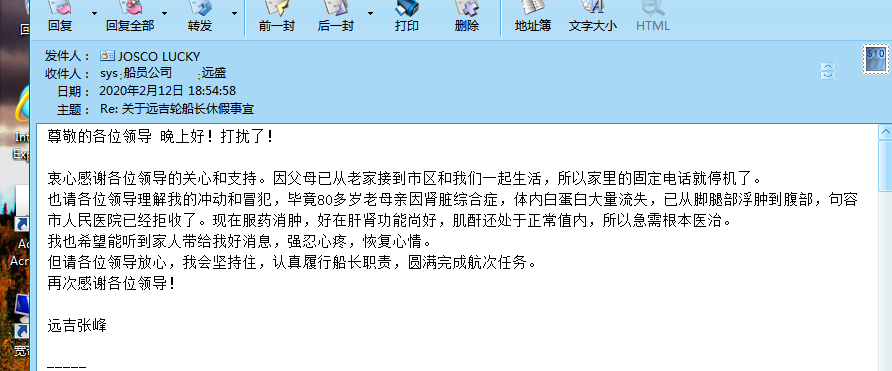 由于新型冠狀病毒疫情的影響,江蘇遠(yuǎn)洋采取了嚴(yán)格的防控措施,保障在船船員身體健康,船舶運(yùn)輸正常運(yùn)行,并暫停了船員換班。然而在疫情最為嚴(yán)峻的時(shí)刻,“江遠(yuǎn)遠(yuǎn)吉”輪船長(zhǎng)張峰得知母親患病住院,需要他回家照顧。