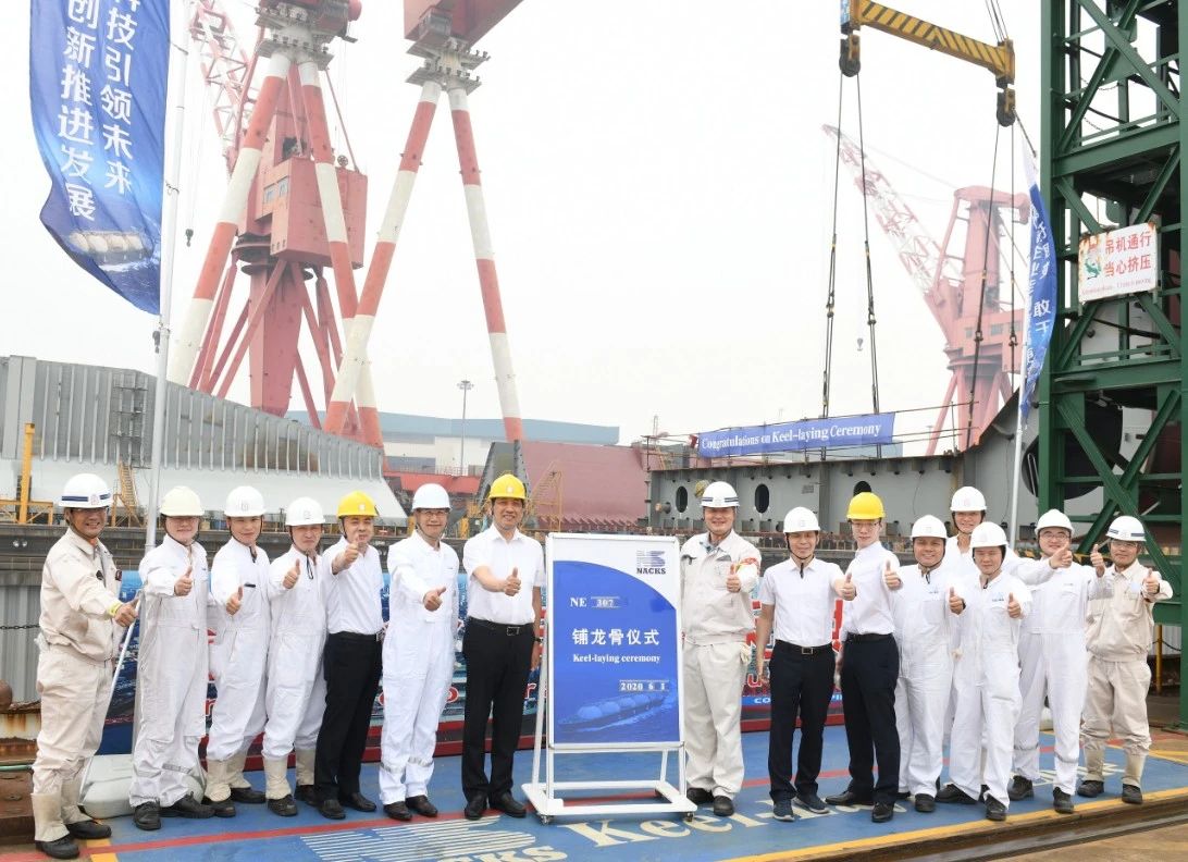 6月1日上午,江蘇遠洋在南通中遠海運川崎船舶工程有限公司投資建造的NE307船在1號船塢舉行鋪龍骨儀式。江蘇遠洋副總經(jīng)理瞿名澤,NK船級社、南通中遠海運川崎相關領導出席儀式。